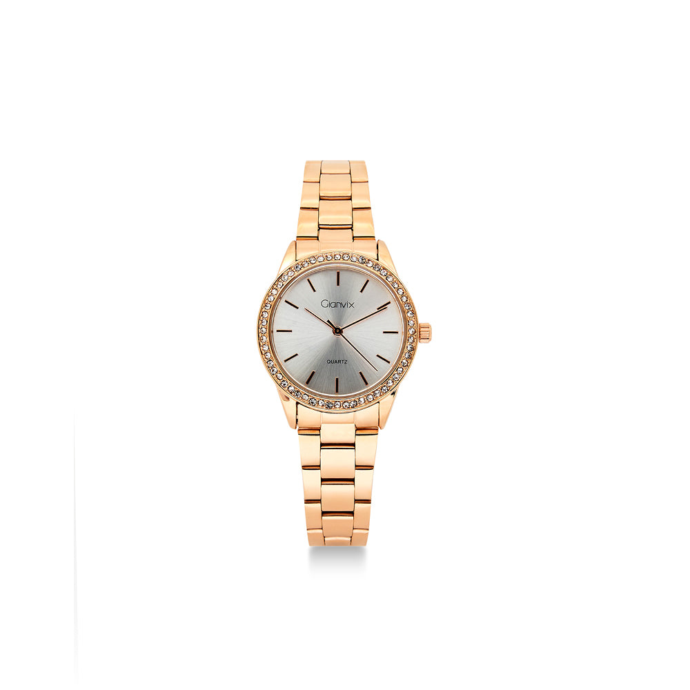 Orologio donna movimento quartz. Cassa in metallo color oro rosa diametro 32mm. Corona a pressione. Fondello in acciaio serrato a pressione. Lunetta con zirconi bianchi. Quadrante silver con indici color oro rosa. Sfere color oro rosa. Bracciale in acciaio lucido color oro rosa con chiusura deployante con pulsanti