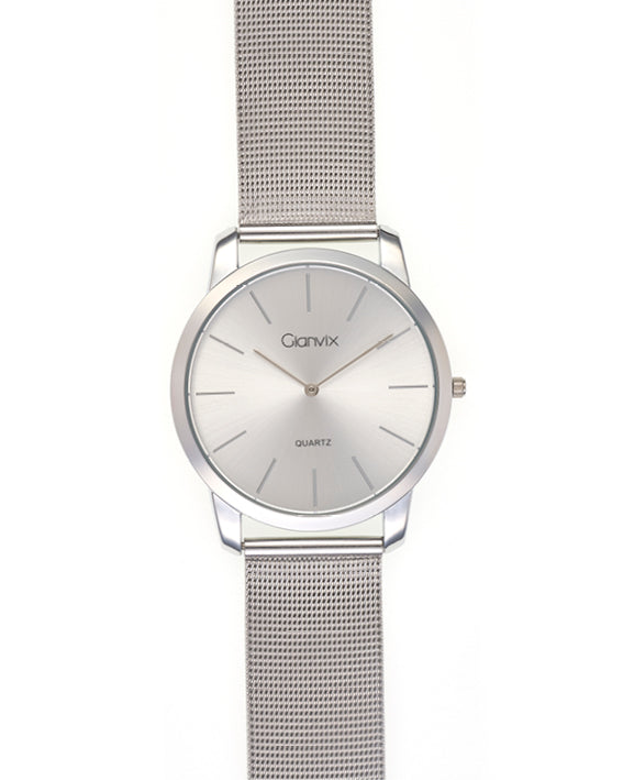 Orologio uomo mvt. quartz. Cassa in metallo diametro 40mm. Lunetta piatta lucida. Corona a pressione. Fondello in acciaio serrato a pressione. Quadrante silver con sfere e indici color silver. Bracciale regolabile in acciaio tessuto con chiusura a scatto scorrevole