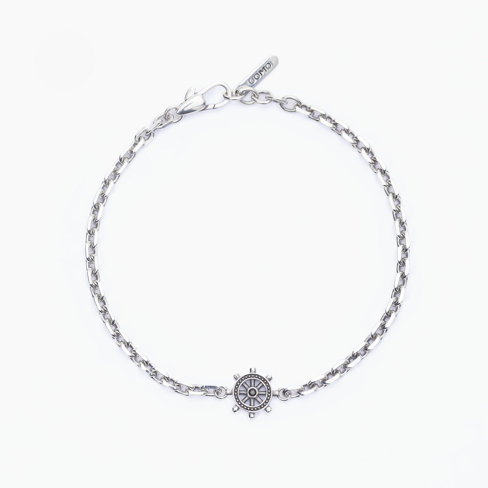 Bracciale da uomo di Mabina Gioielli. Bracciale a maglia forzatina in argento brunito con piastra con elemento timone. Dimensione elemento: 10.80×10.80 mm. Diametro degli zirconi: 1.75 mm. Larghezza della catena: 3.60 mm. Chiusura con moschettone. Misura unica, lunghezza 21 cm.