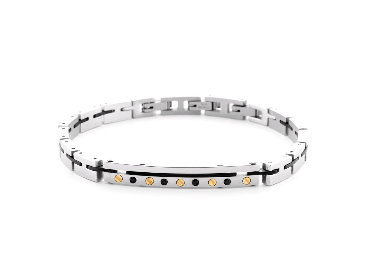 Bracciale Uomo 4US acciaio con targa pietre nere e oro 18k. Misura regolabile. Collezione autunno inverno 24.