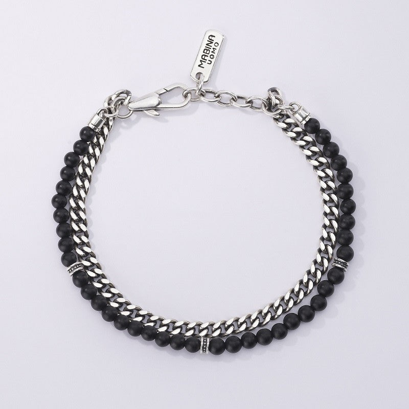 Bracciale da uomo di Mabina Gioielli. Bracciale in argento 925 brunito con doppia catena groumette e sfere in agata nera. Diametro delle sfere in agata nera: 4 mm. Chiusura con moschettone. Misura regolabile, lunghezza da 19 a 21 cm. La referenza è 533435