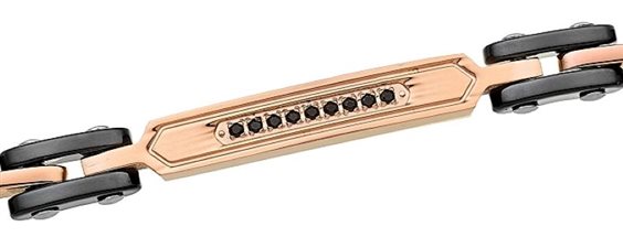 Bracciale in acciaio trattato pvd rosè e ceramica. Nella targa centrale sono incastonati degli spinelli neri. La chiusura è a scatto e dà la possibilità di accorciarlo. Il gioiello viene venduto e spedito con scatola originale come previsto dal brand.