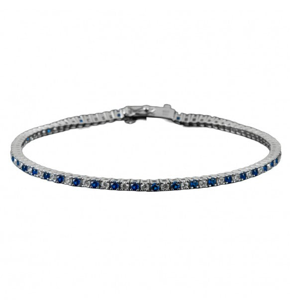 Bracciale tennis in argento con zirconi 2mm bianchi e blu di Cesare Paciotti.Il gioiello è realizzato in argento con zirconi 2mm bianchi e blu con dimensioni di 21 cm.