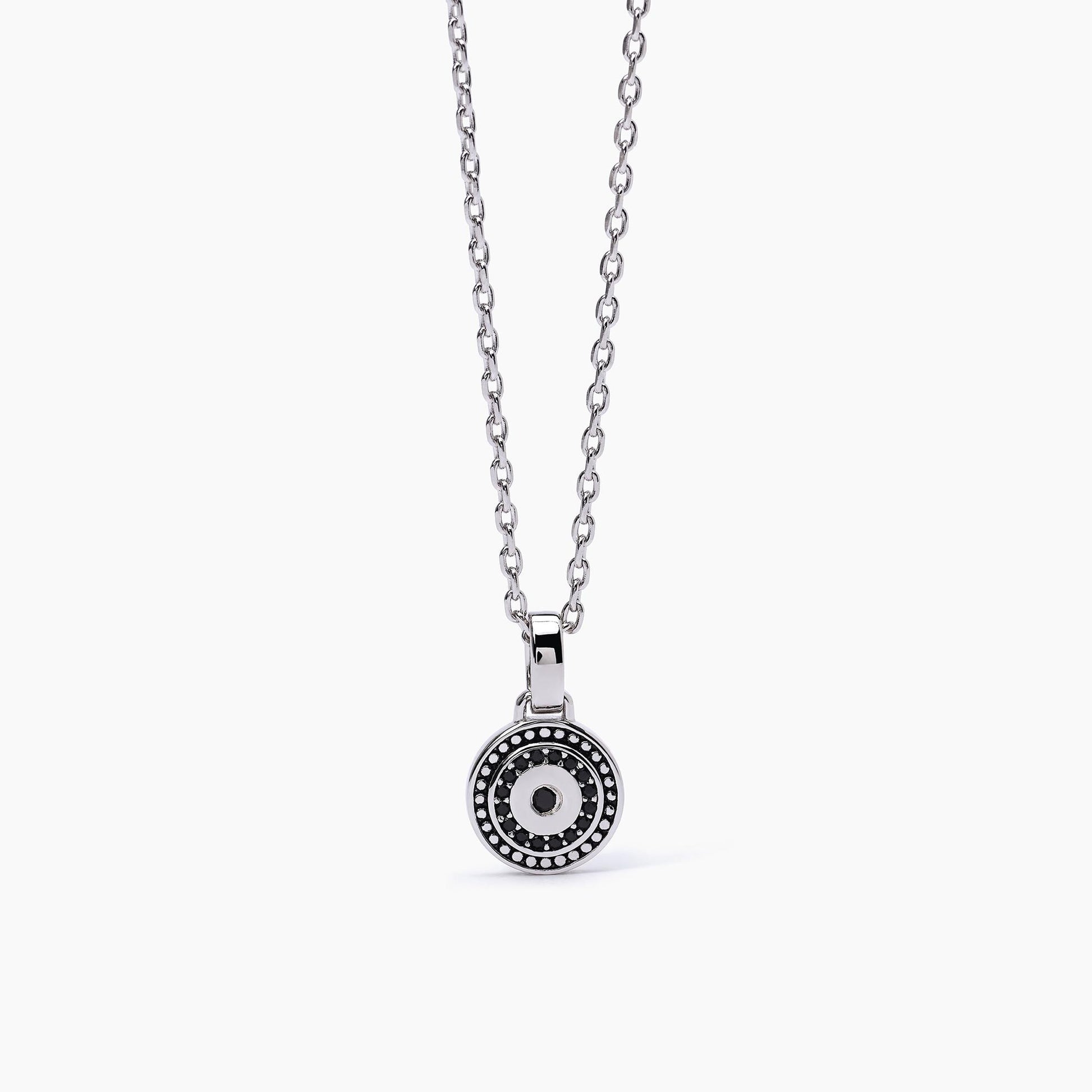 Collana da uomo di Mabina Gioielli della collezione Beniamino. Collana in argento 925 finitura rodiata, ciondolo tondo Ø 10mm, zirconi neri Ø 1.25 mm, catena forzatina lunghezza 50 cm. La referenza è 553484