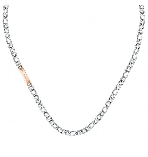 Collana da uomo Maserati realizzata in acciaio anallergico. Laterale placcato oro rosa logato e impreziosito da cristalli bianchi.