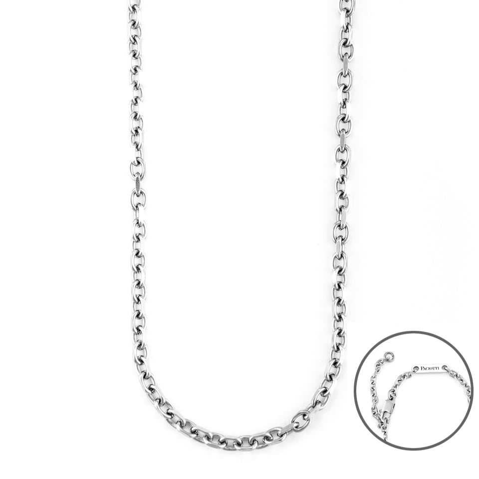 Collana Uomo della Marca 4US di Cesare Paciotti, il gioiello è realizzato in acciaio inossidabile di colore argento, modello girocollo maglia rolò, la lunghezza è da 50 cm a 55 cm regolabile con anellini, chiusura al moschettone.