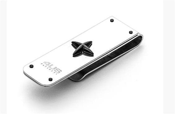 Fermasoldi della collezione 4US Cesare Paciotti da uomo. Colore: argento e nero. Il fermasoldi è in acciaio inossidabile 316L con trattamento in pvd nero con decoro a croce stellata e incisione "4US Paciotti".