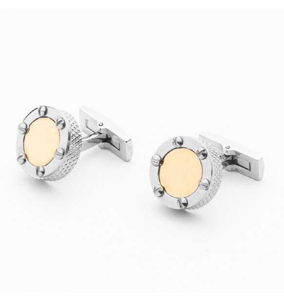 Gemelli da camicia tondi realizzati in acciaio anallergico con finitura lucida e centrale placcato oro rosa.