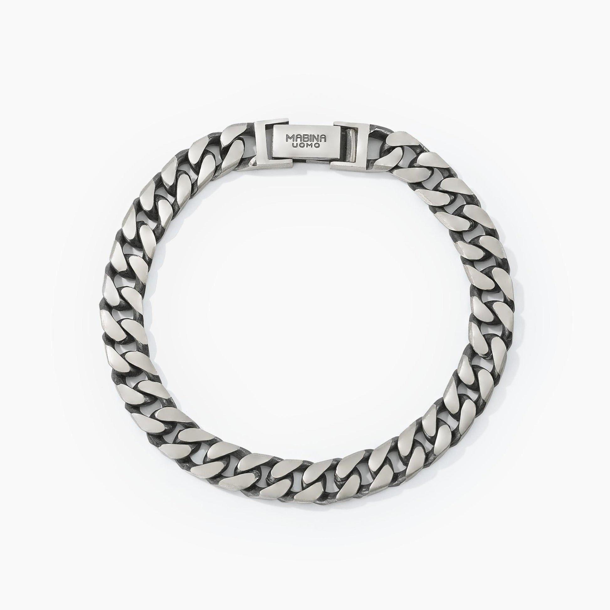 Bracciale da uomo di Mabina Gioielli. Bracciale groumette in argento 925 brunito con finitura vintage. Larghezza della catena: 6 mm. Chiusura a pinza con molla. Misura m, lunghezza 20 cm. Peso: 17,50 g. La referenza è 533421-m