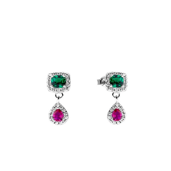 Orecchino pendente da Donna con Pietra Quadrata Verde e a goccia Rubino con Zirconi