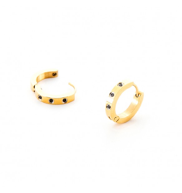 Orecchini a cerchio da uomo realizzati in acciaio anallergico dorato con zirconi neri.