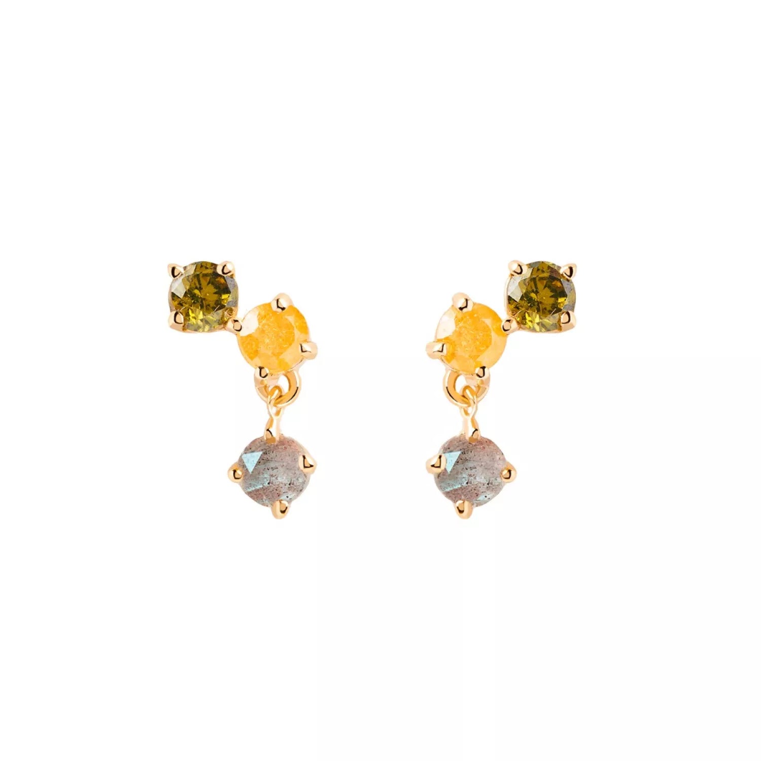 Orecchini flora gold da donna della collezione juno di PDPaola. Il gioiello è realizzato in argento sterling 925 con rifinitura placcata in oro 18k. Le pietre sono: labradorite, iced zirconia gialla, zirconia verde. La referenza è ar01-543-u