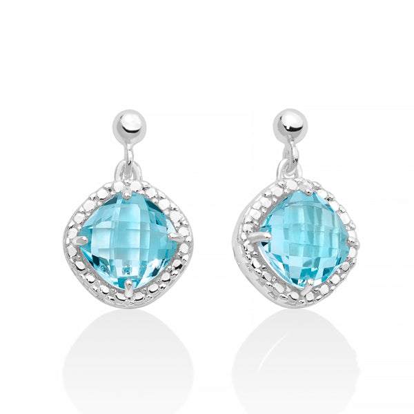 Orecchini da donna di Miluna di forma quadrata della collezione Gemma del Cielo - ERD2693 Orecchini in argento con un prezioso Topazio naturale azzurro di forma quadrata, taglio sfaccettato che lo rende brillante. Misura topazio: 8 x 8 mm.