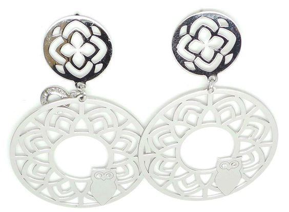 Orecchini in argento rodiato, pendenti lunghi 6 cm, con traforo geometrico e gufo inserito con occhi in zirconi, chiusura perno a farfalla.