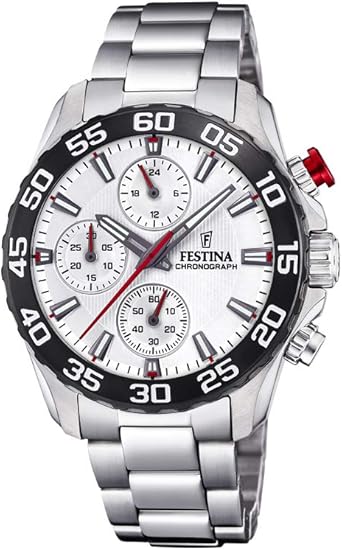 Orologio Cronografo Da Ragazzo Di Festina Della Collezione Junior. Cassa In Acciaio Inossidabile 316L Del Diametro Di Mm 36.5 E Cinturino In Acciaio Inossidabile 316L. Colore Quadrante: Bianco. Orologio Cronografo Con Movimento Mjs10. Resistenza All'Acqua: 5 Atm. La Referenza È F20457/1