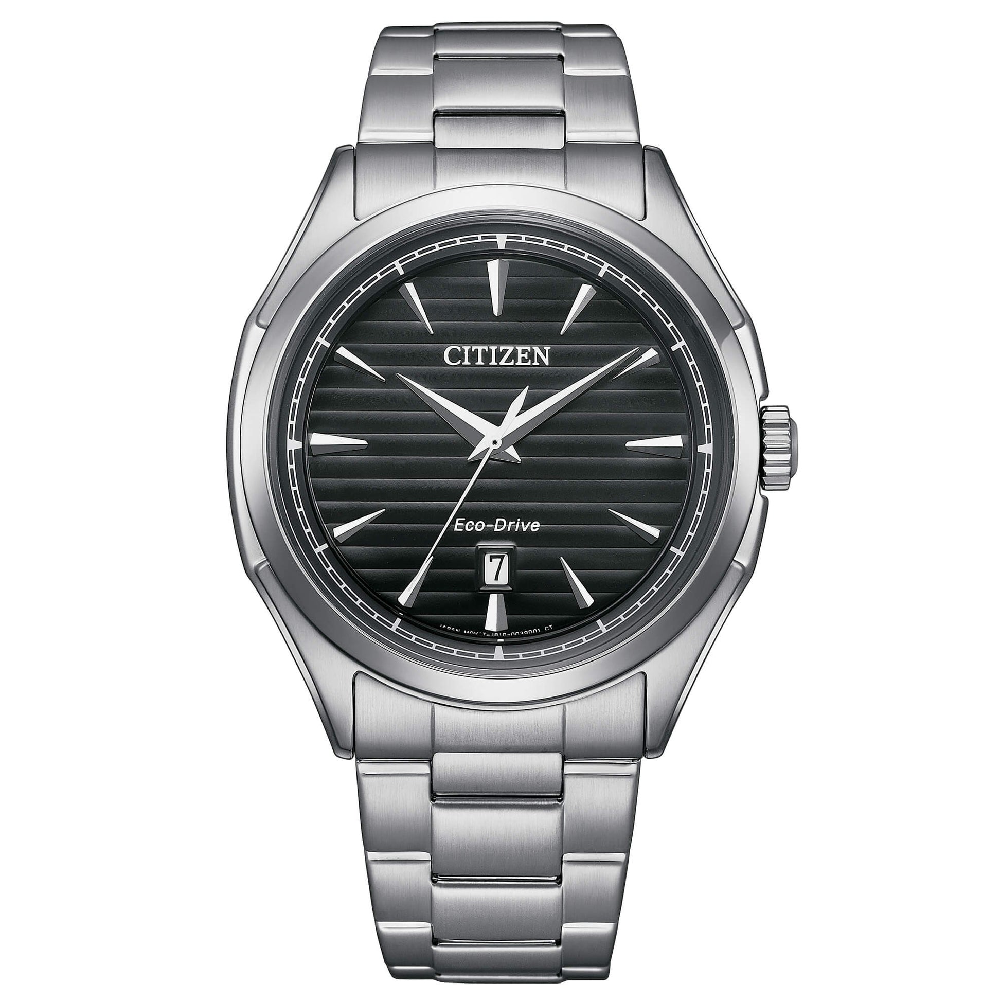 orologio uomo citizen, AW1750-85E, collezione elegant, movimento eco-drive, solo tempo, cassa in acciaio 41mm, quadrante nero con datario, fondo serrato a vite, bracciale in acciaio con chiusura di sicurezza a pulsante, resistenza all'acqua 10atm