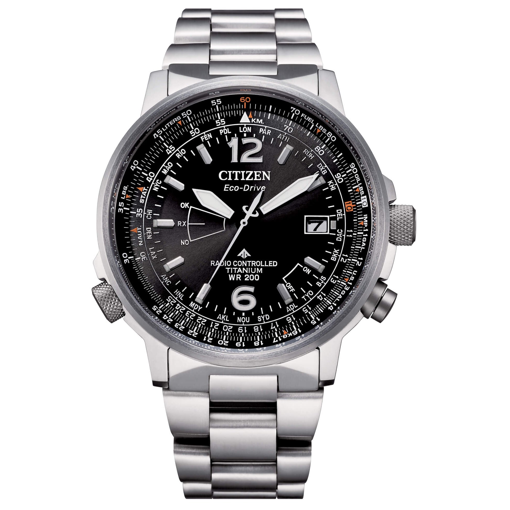 Orologio radiocontrollato da uomo di Citizen della collezione pilot. Orologio con cassa in supertitanio con fondello a vite e diametro cassa 42,5 mm. Orologio con quadrante nero con indici e sfere in bianco luminor. Orologio con bracciale in supertitanio con chiusura di sicurezza. Orologio con resistenza all'acqua di 20 atm ed eco drive con riserva di carica di 24mesi. Orologio radiocontrollato a 5 canali , world timer con orario di 26 cttà, calendario perpetuo, sistema regolo calcolatore areonautico con datario e vetro zaffiro. La referenza è cb0230-81e