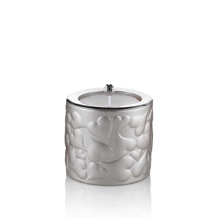Vasetto con Candela di Ottaviani della collezione Cuori. Accessorio realizzato in resina, argento con candela. Dimensioni: Cm Ø 7,5; H 6,7.