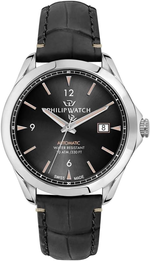 Orologio automatico da uomo di Philip Watch della collezione Blaze. Orologio con cassa in acciaio lucido e satinato della misura di 46,7x41mm e cinturino in pelle. Orologio dotato di vetro zaffiro. Orologio con mvt eta sm 2824/2 a2 nov s.11’1/2 pw. La resistenza all’acqua è di 10 atm.